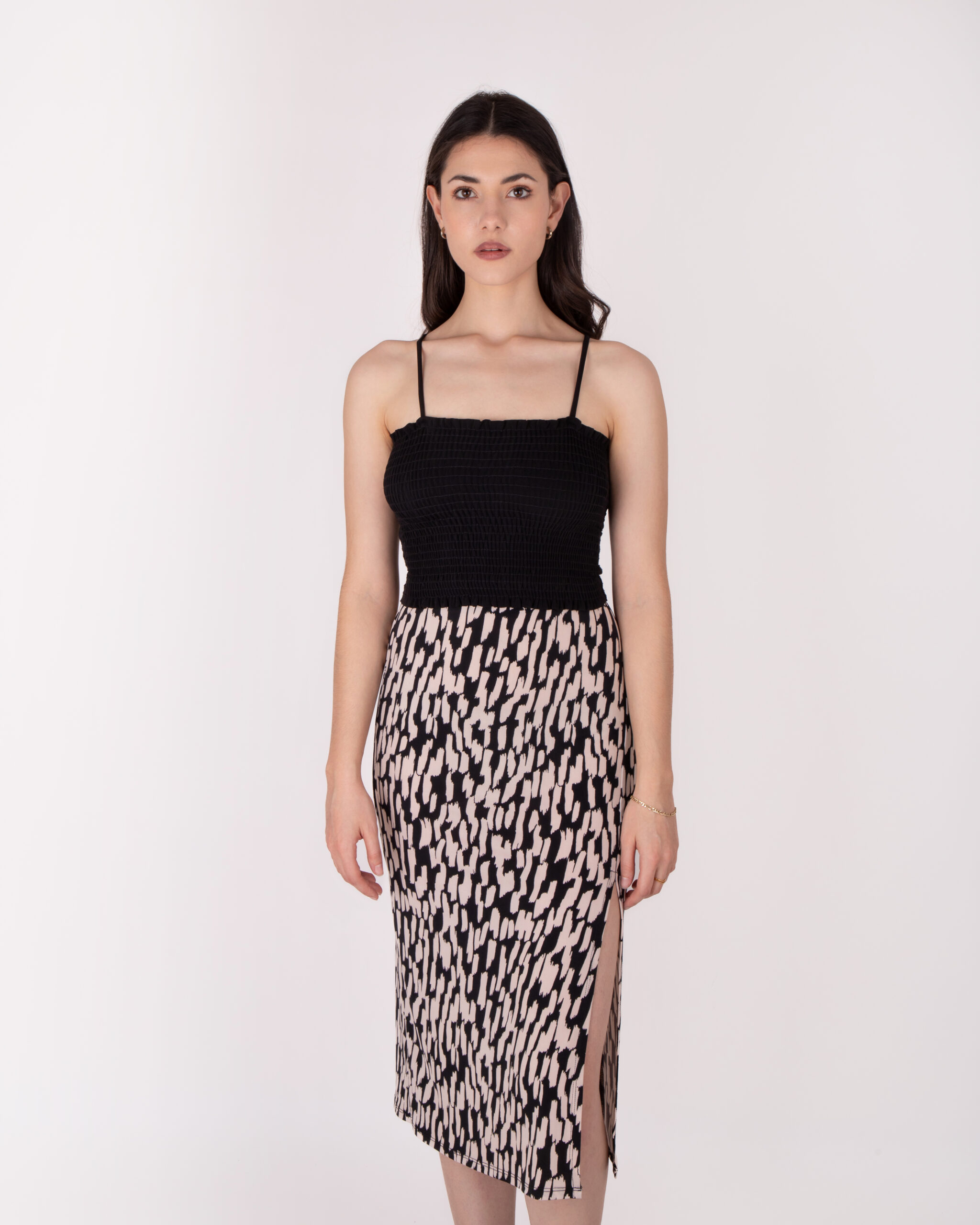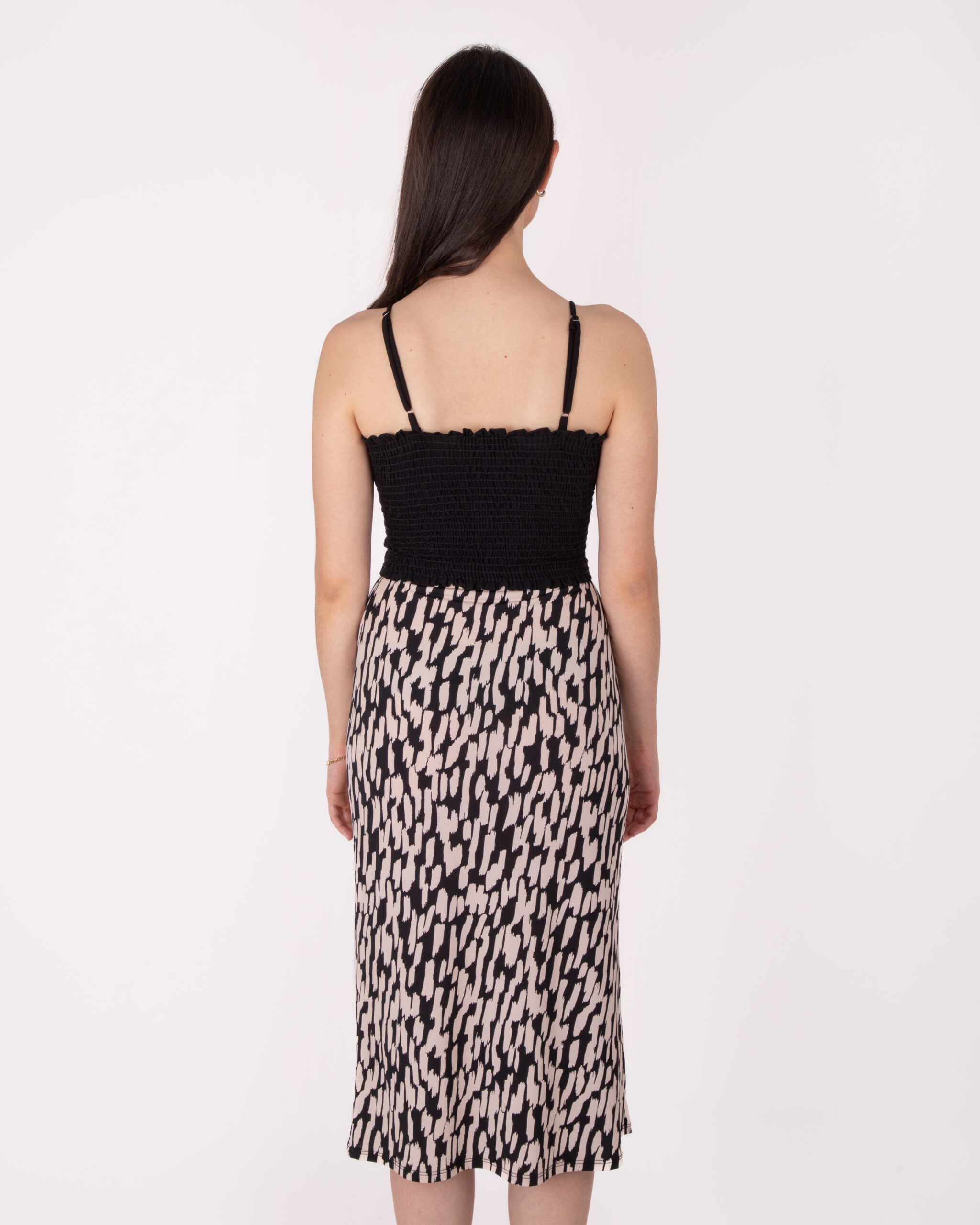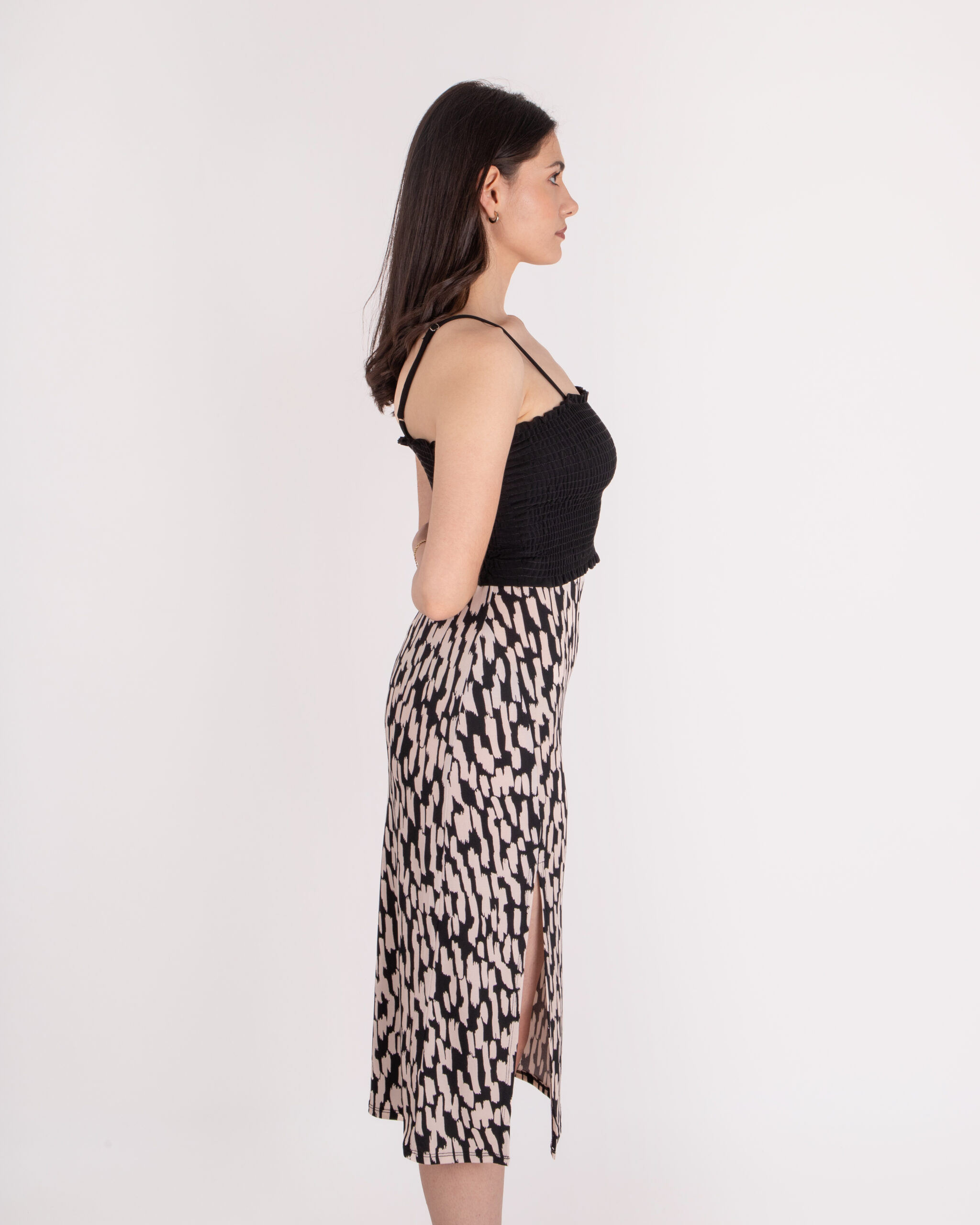 Falda de largo medio, con elástico en la cintura, pijazo a un costado de la pierna.