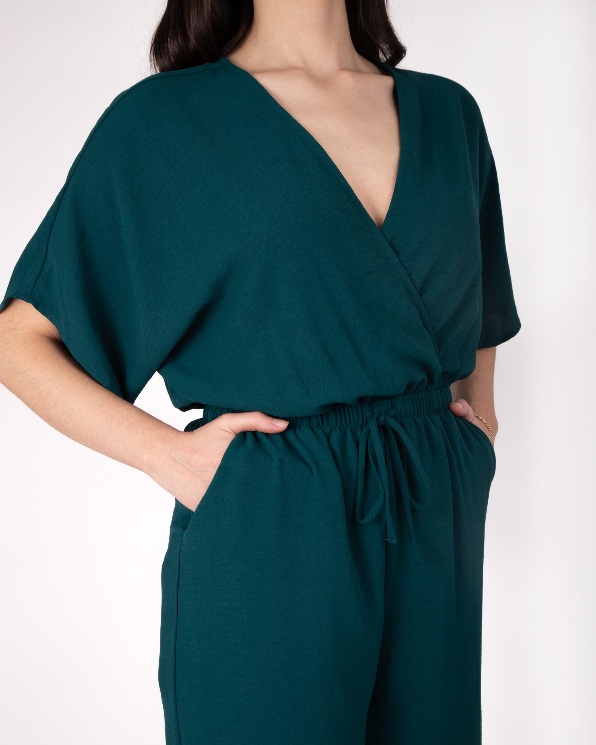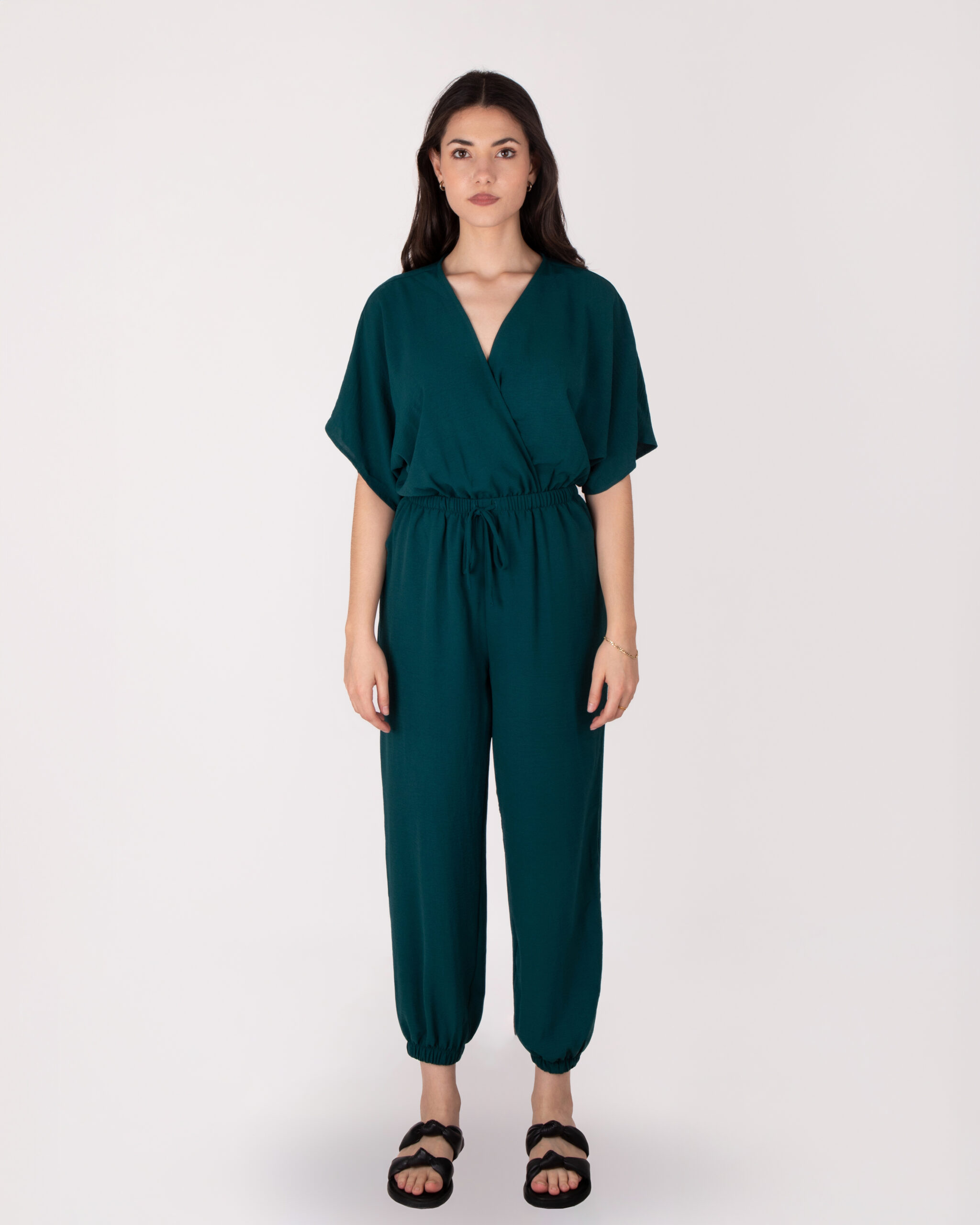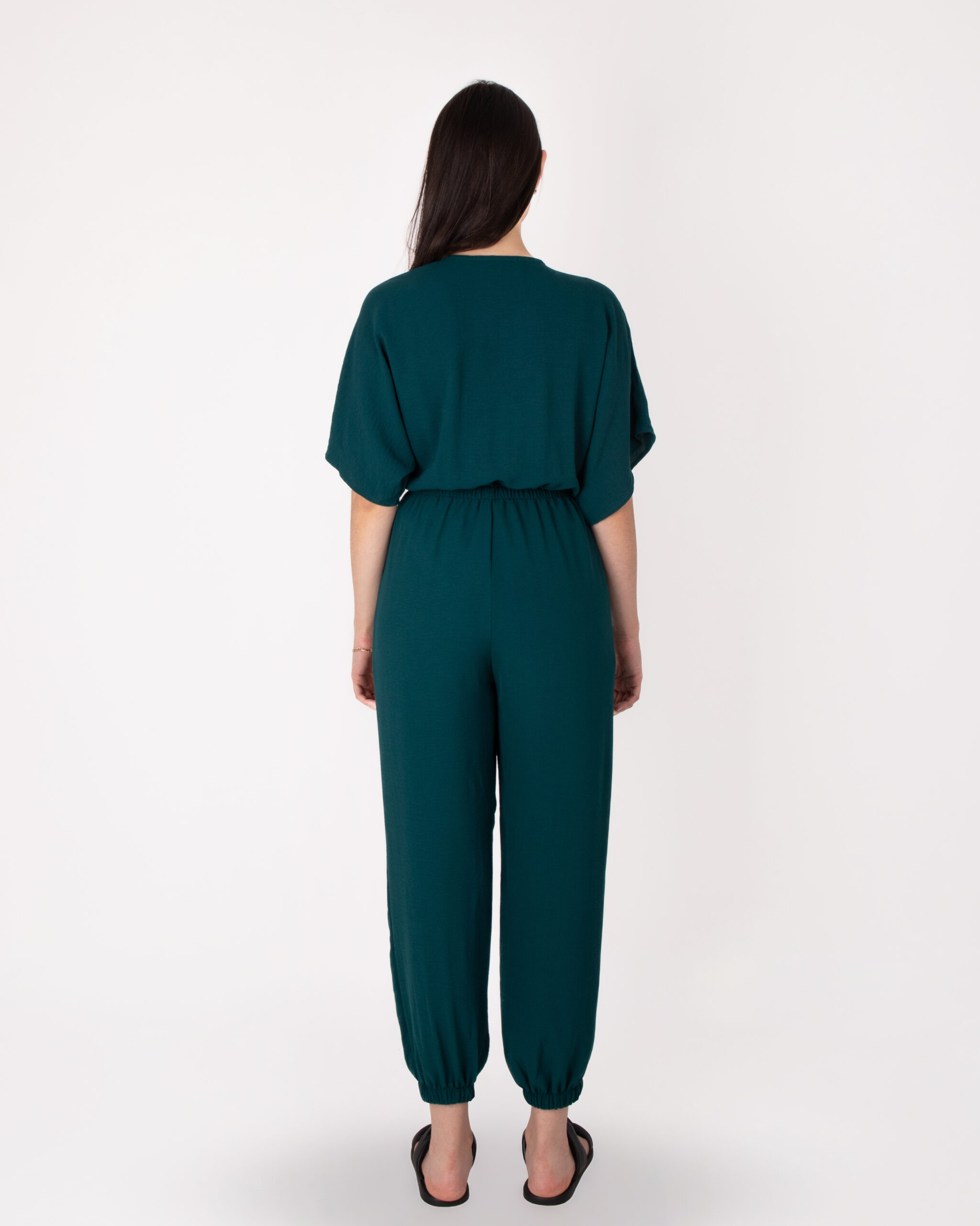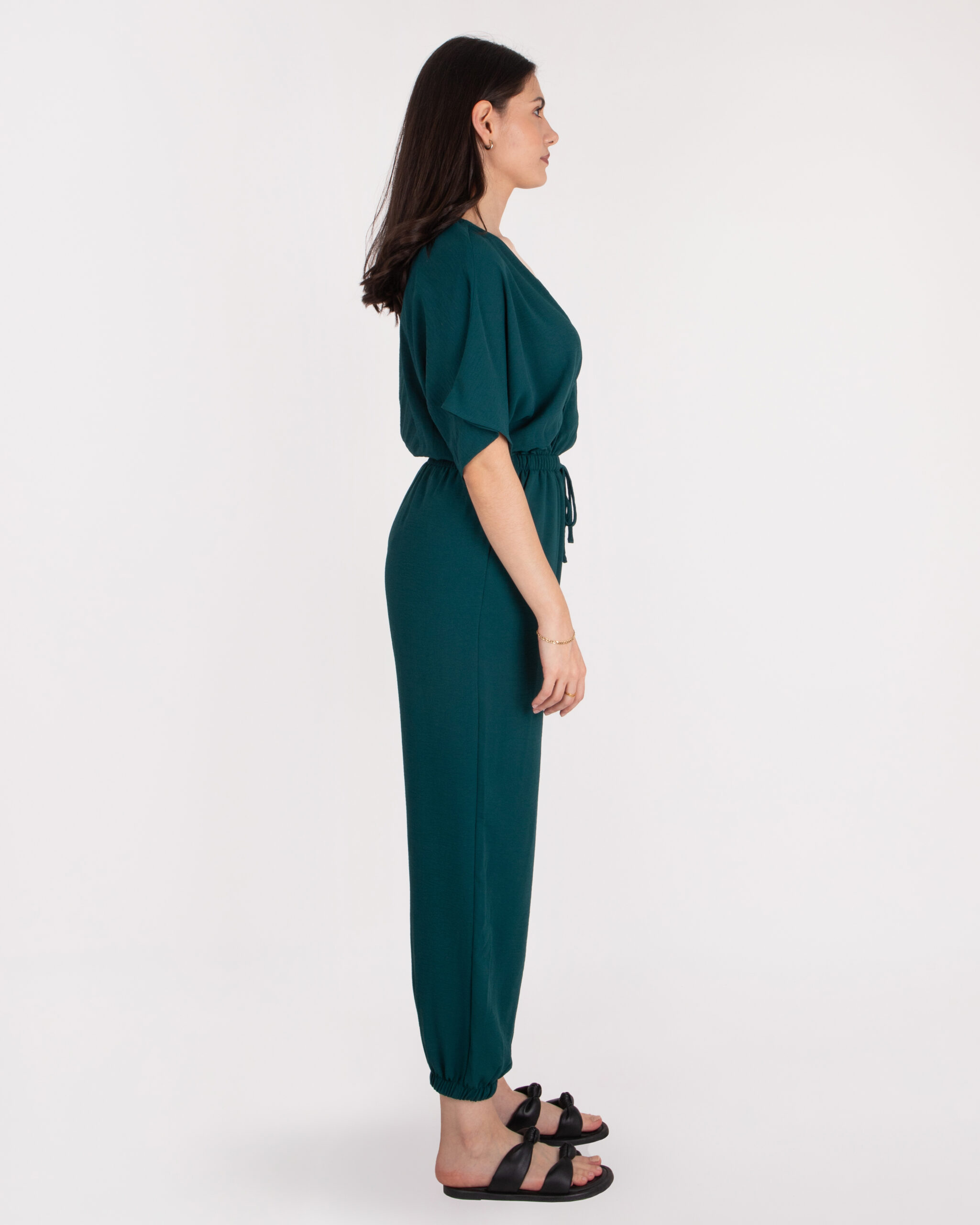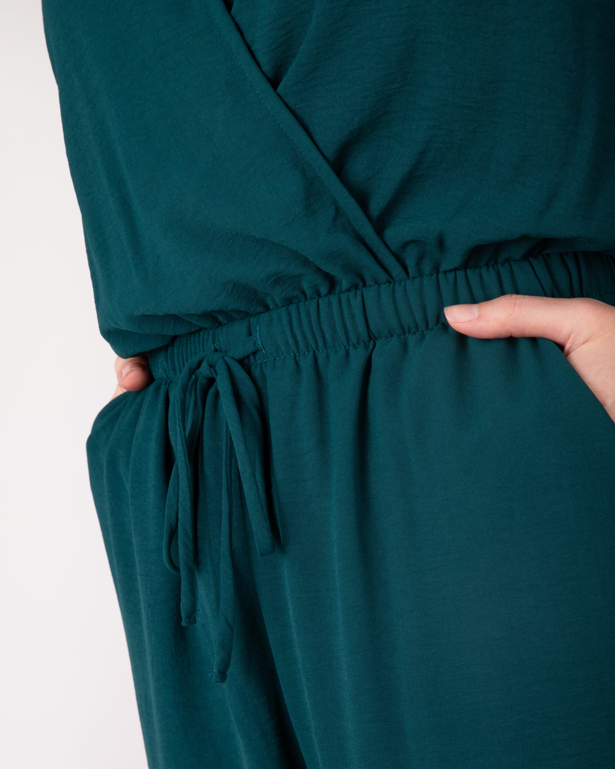 Jumper largo, cuello uve, mangas holgadas, elástico en la cintura y en la parte de abajo, pitas para amarrar