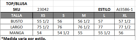 | Talla | S, M, L, 1X, 2X, 3X |