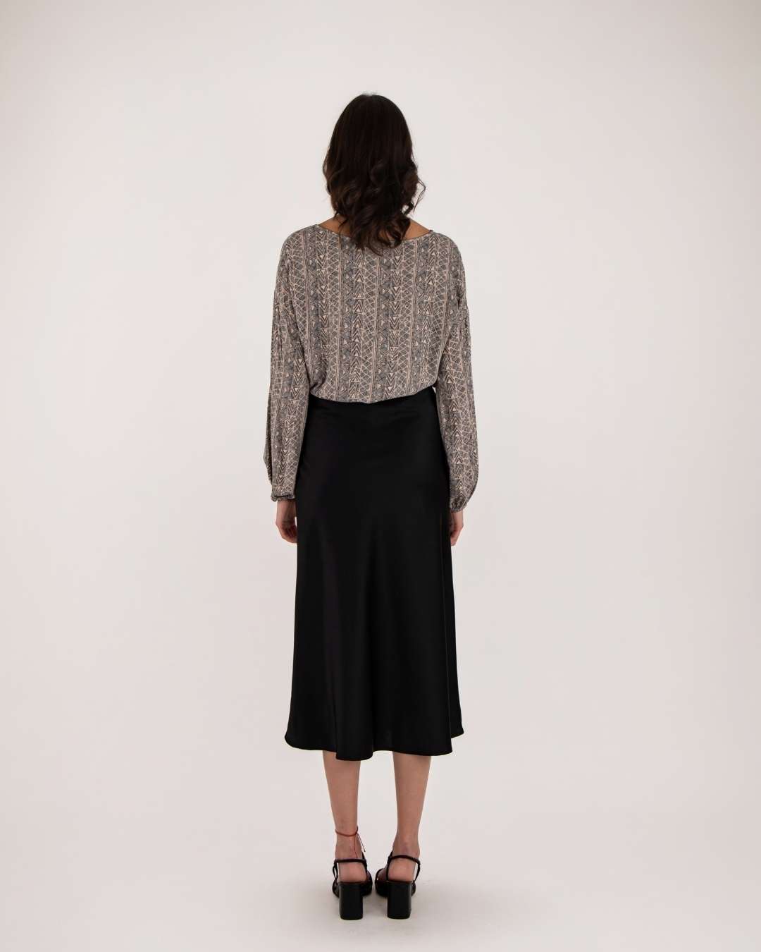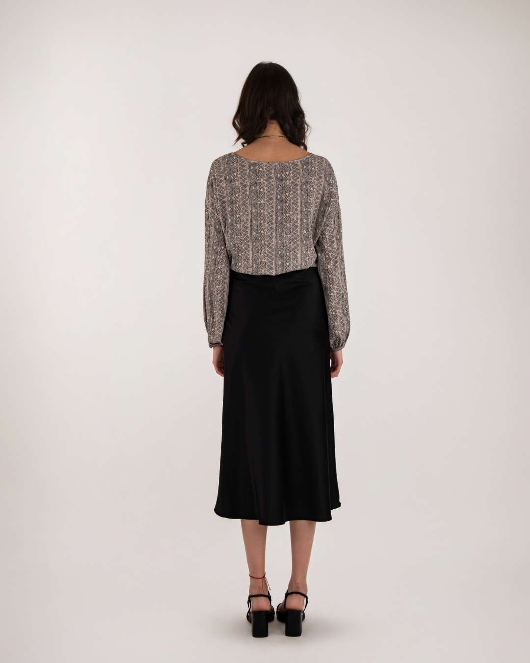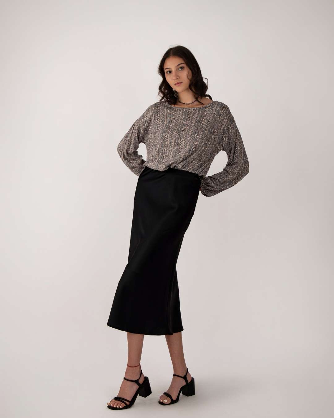 Top, escote recto, manga larga y cintura acabadas en elastico, estampado abstracto