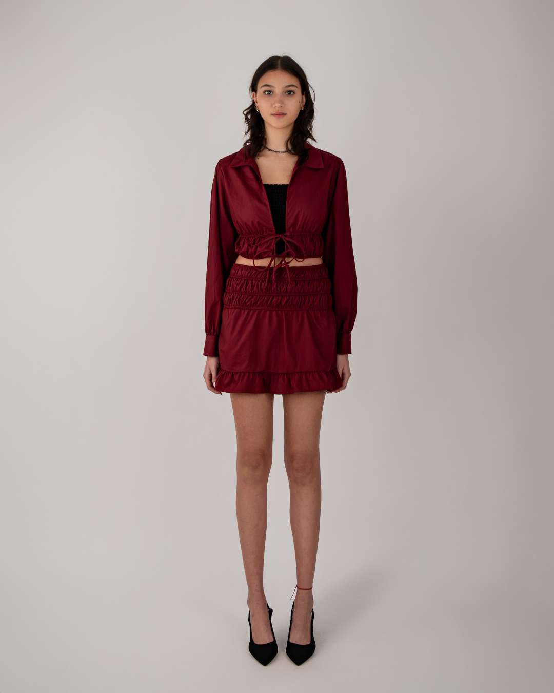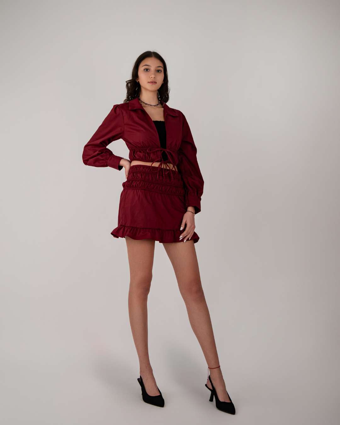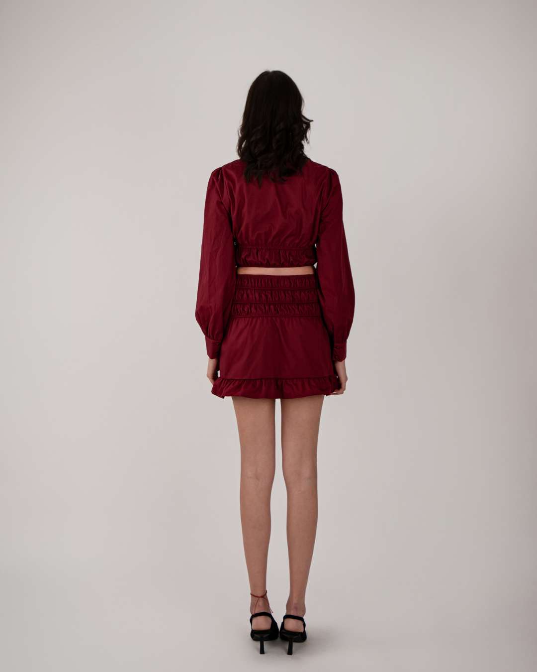 Top con cuello acabado en sampa, volantes, elástico en la parte de la cintura y detalle de botones en las muñecas.