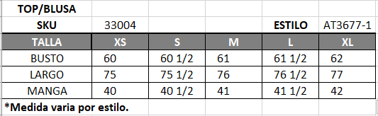 | Talla | S, M, L, 1X, 2X |