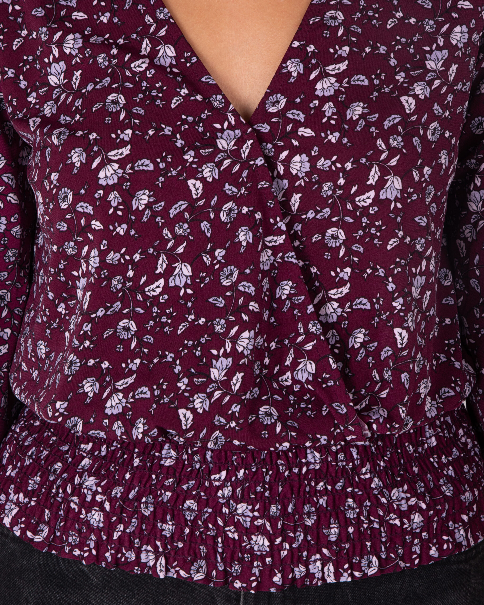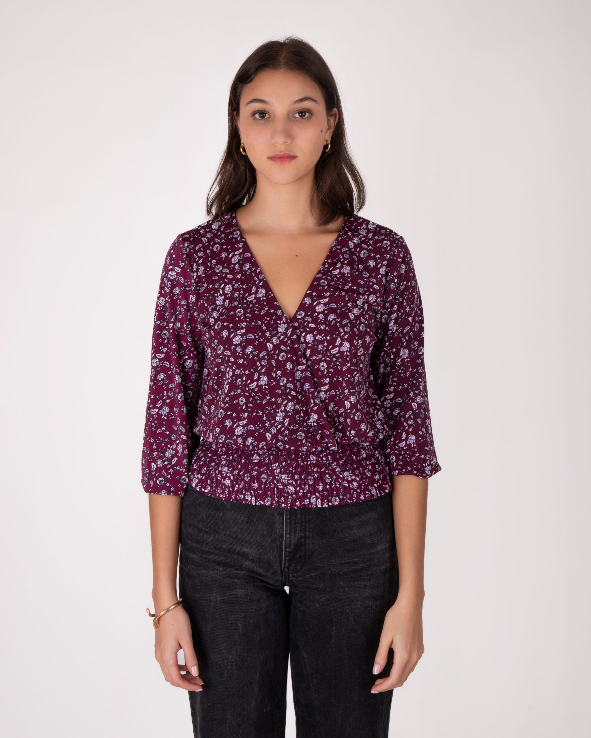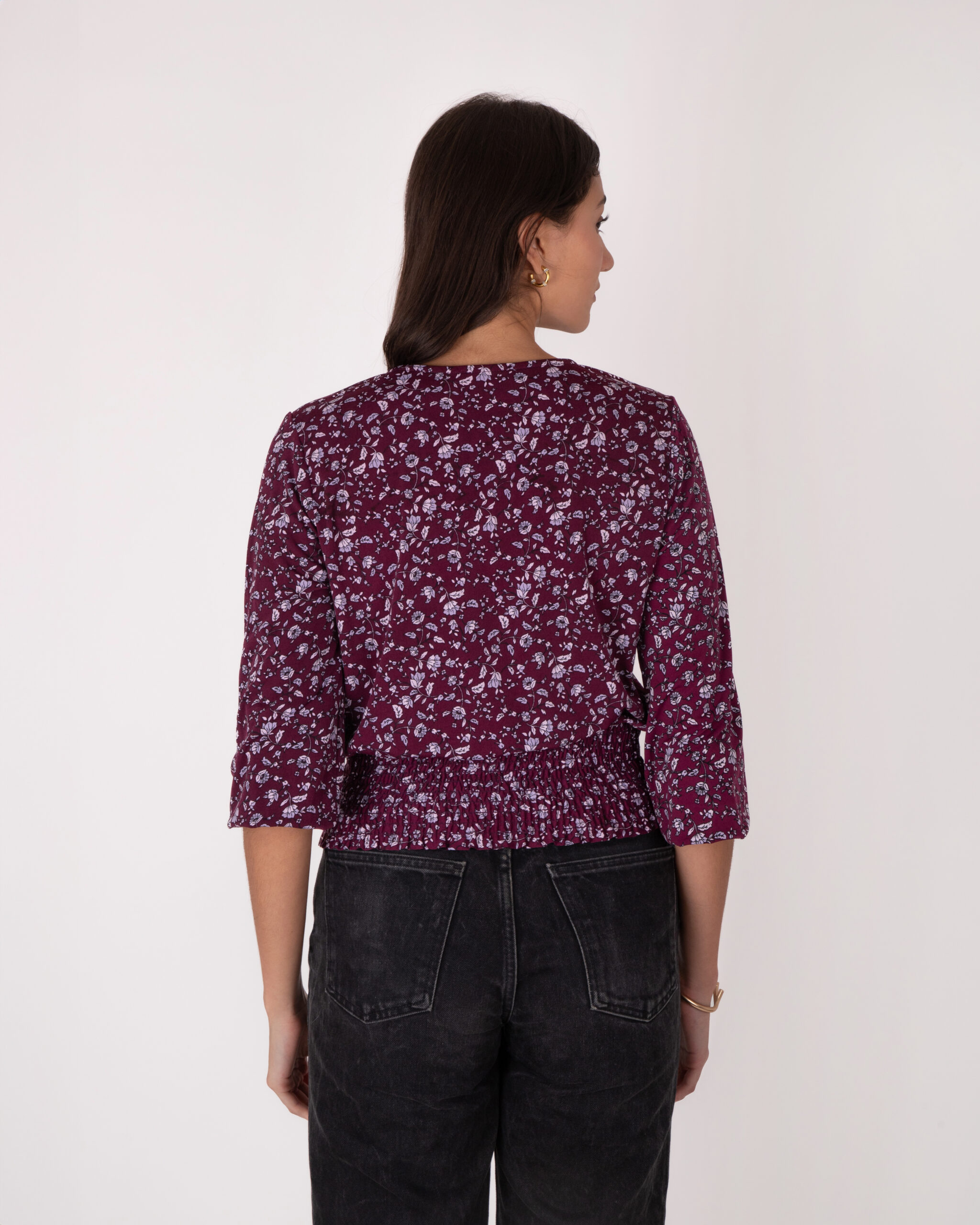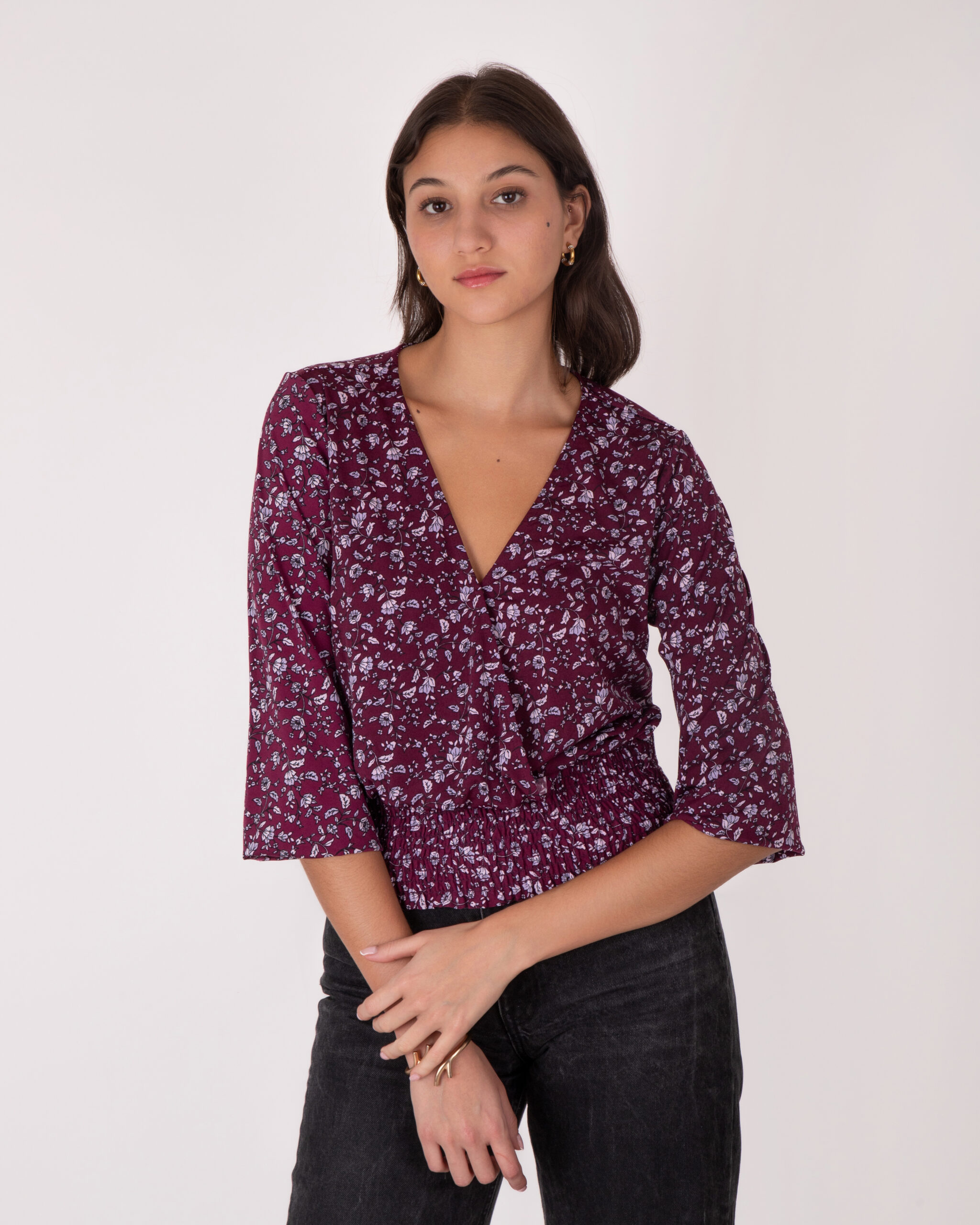 Top con mangas medias y ajustadas, cuello uve y detalle de botón, smoking en la parte de abajo