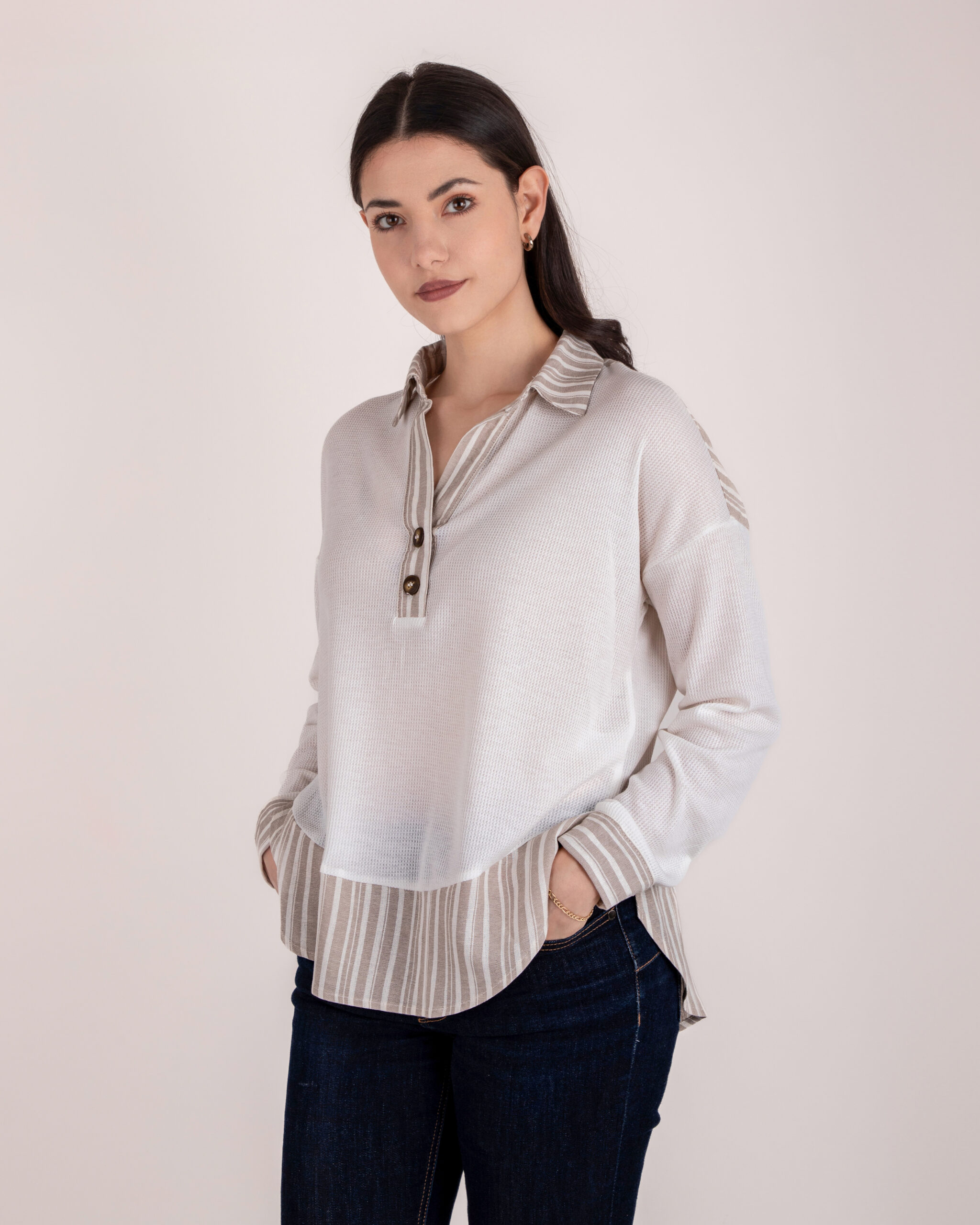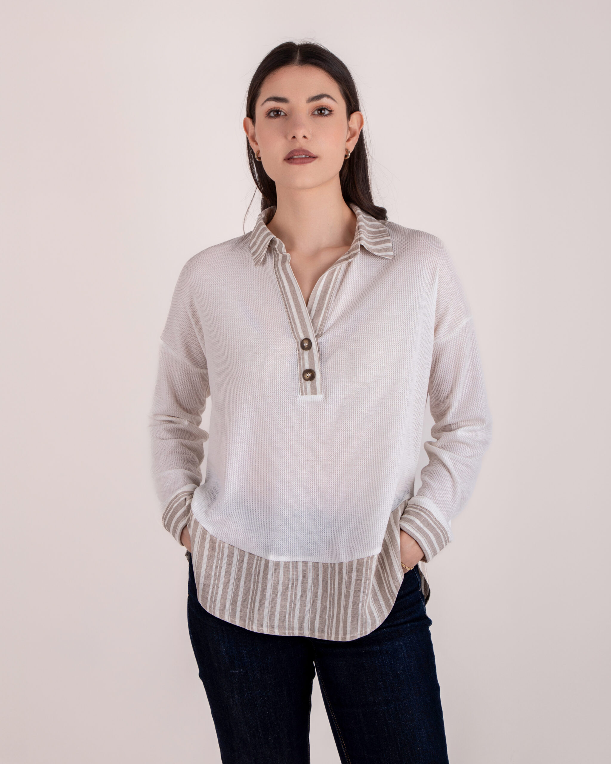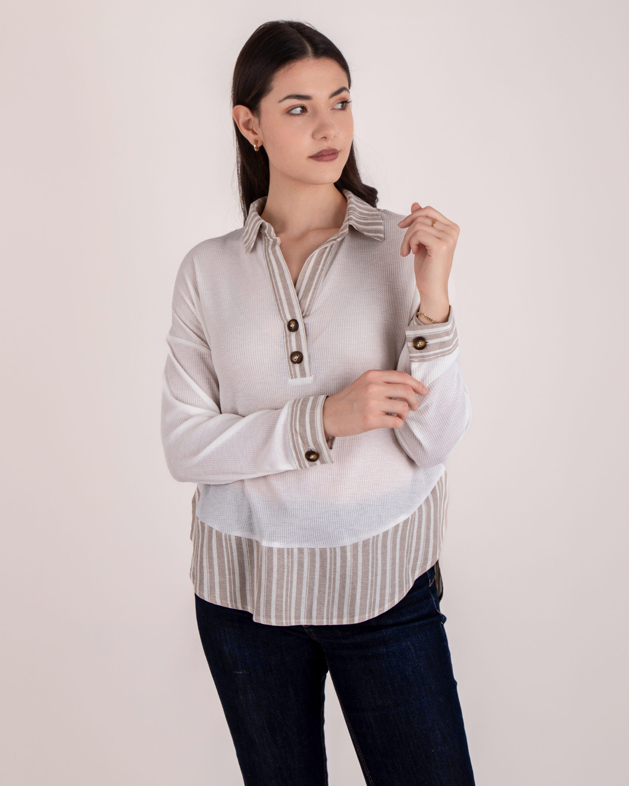 Top manga larga, detallado abstacto en mangas y la parte debajo de la blusa, cola de pato, con botones en medio, placket
