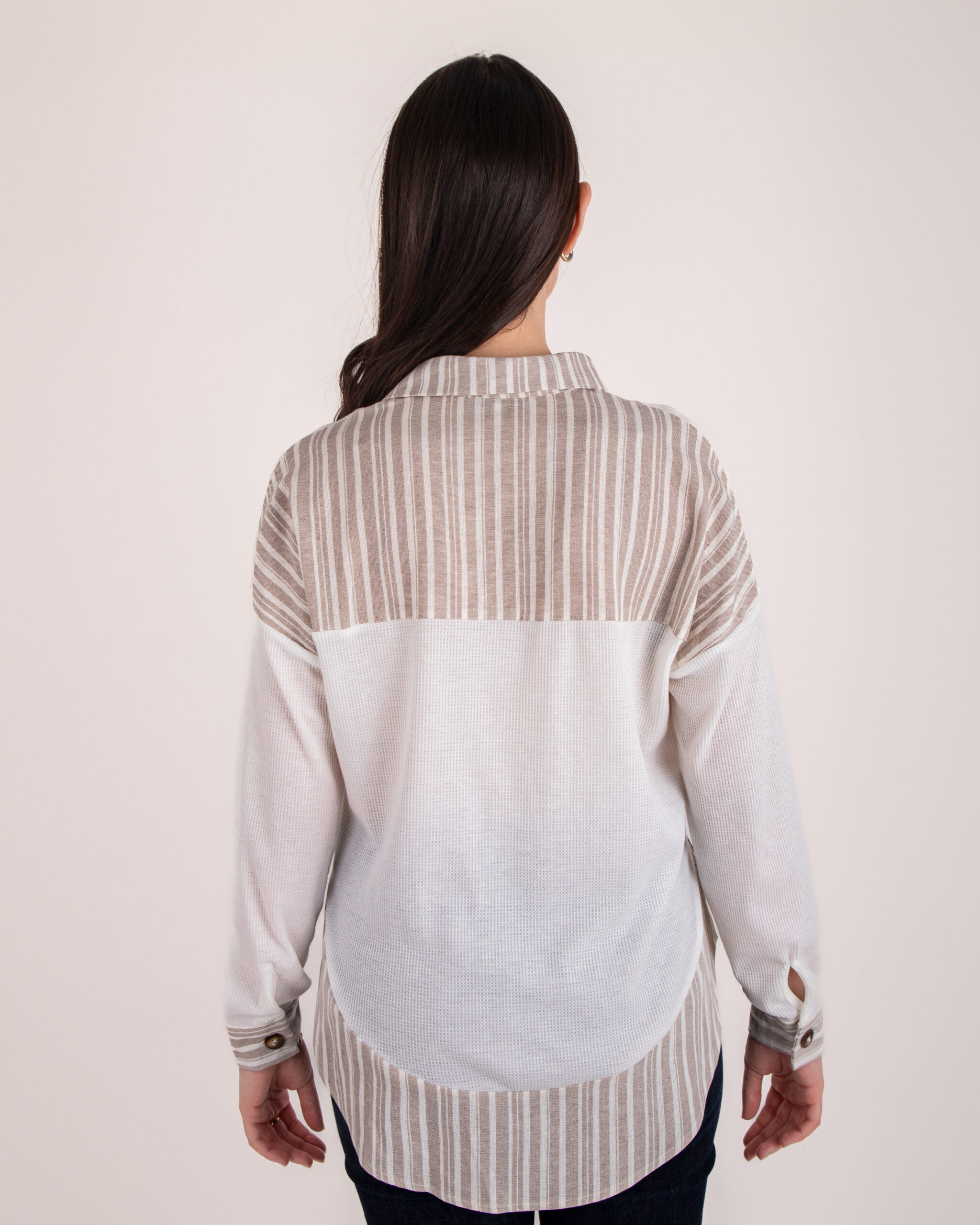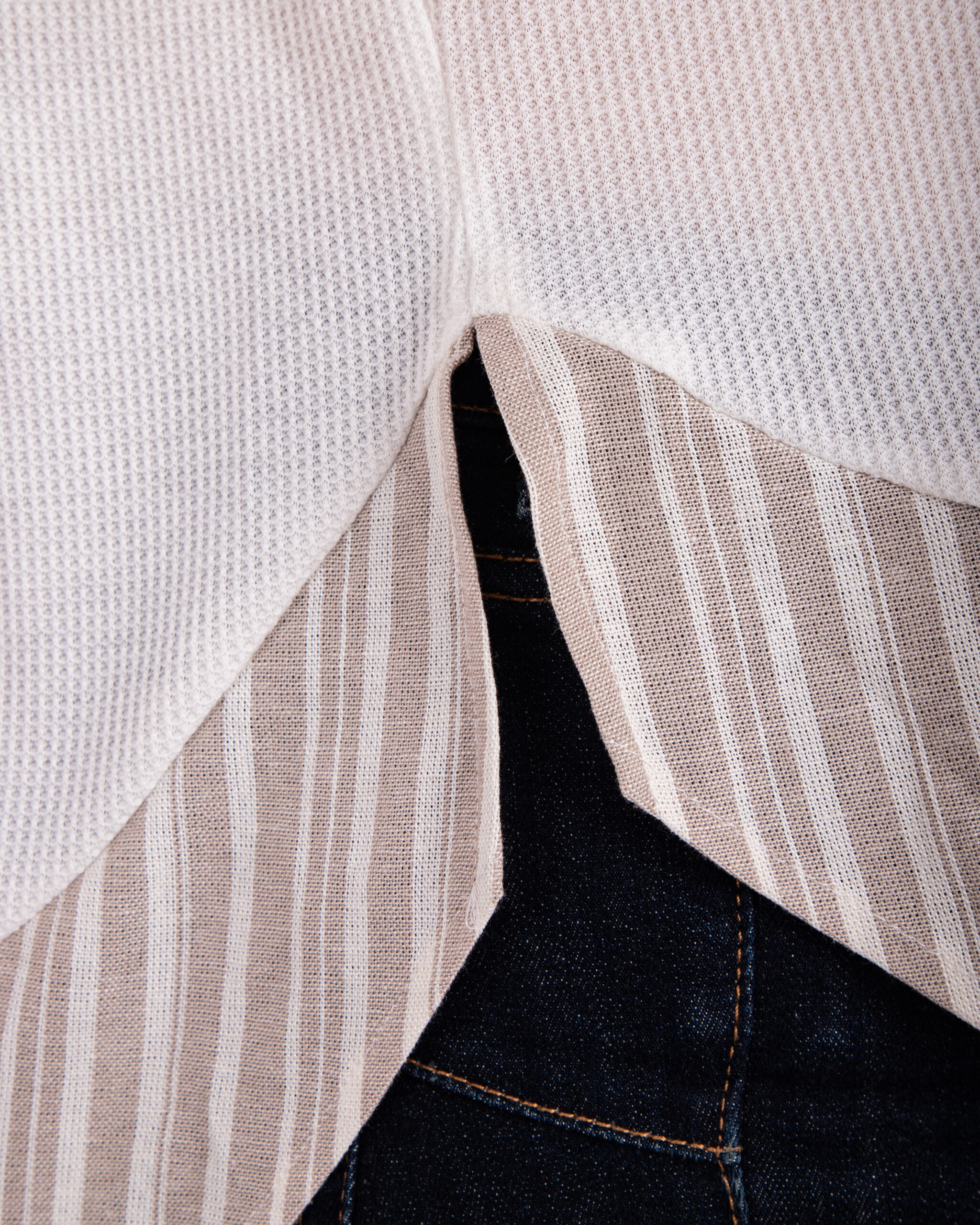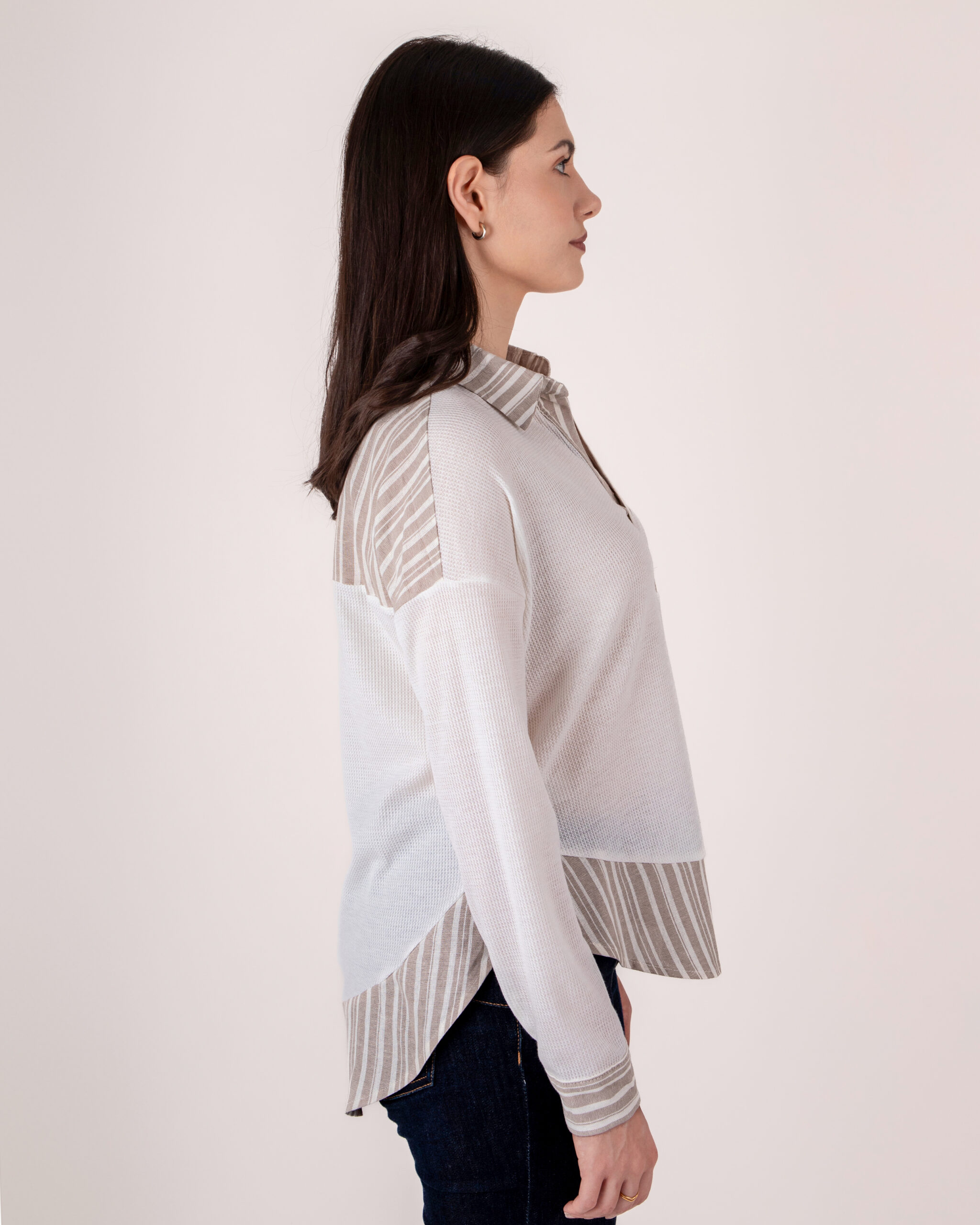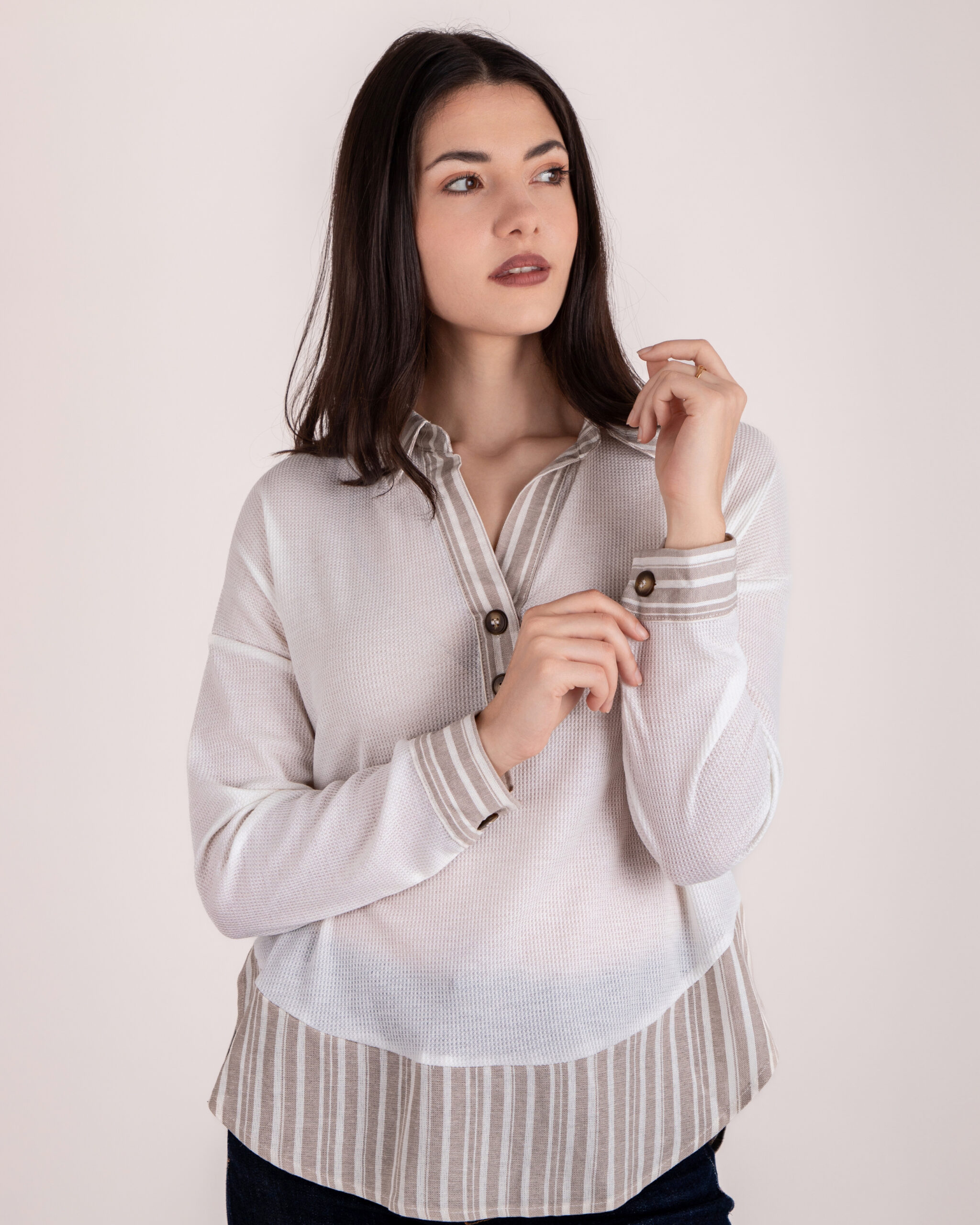 Top manga larga, detallado abstacto en mangas y la parte debajo de la blusa, cola de pato, con botones en medio, placket