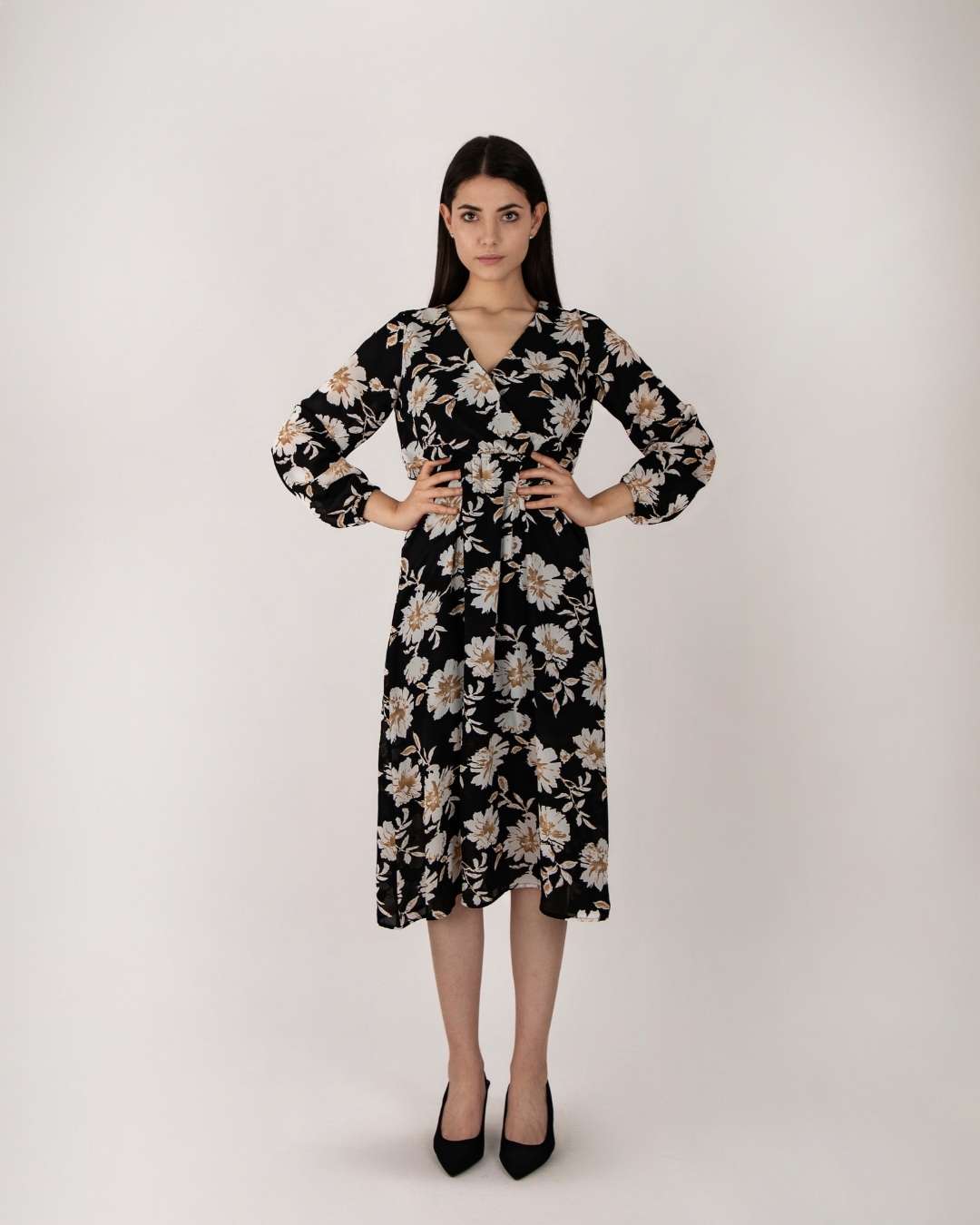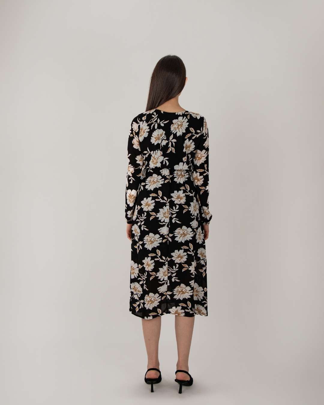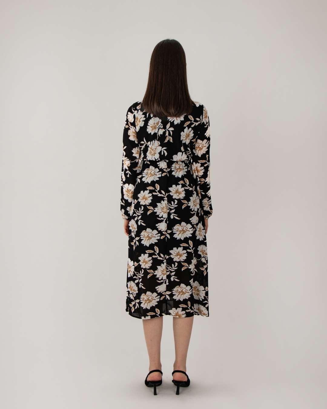 Vestido largo, cuello en V, manga larga acabada en elástico y en la cintura talle alto, botón a presión en la parte superior.