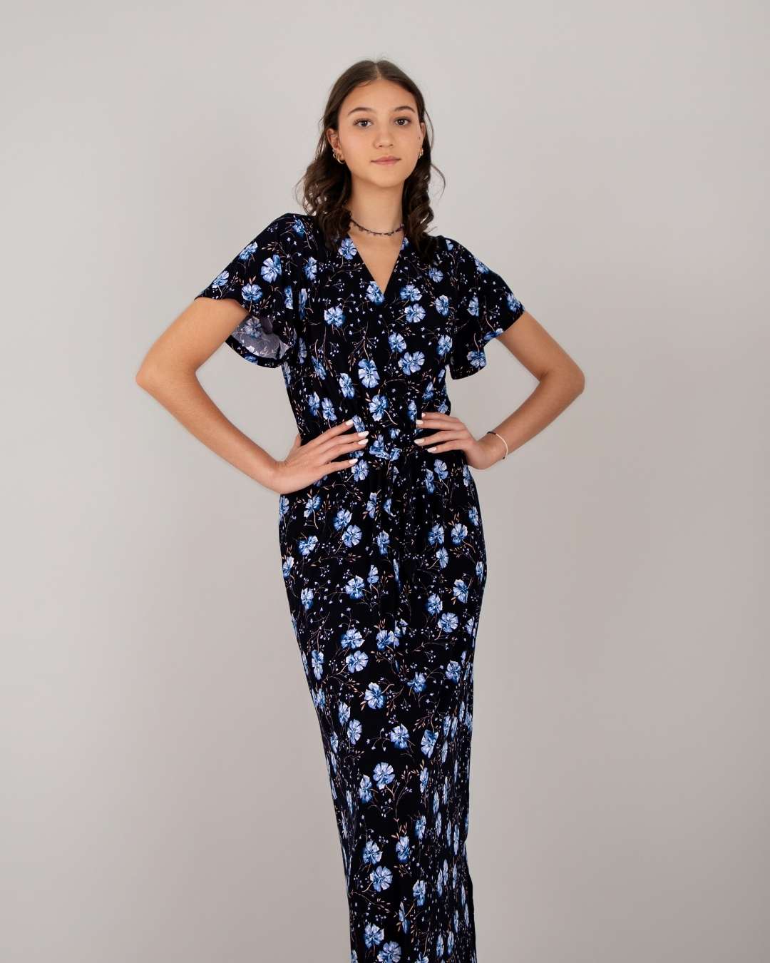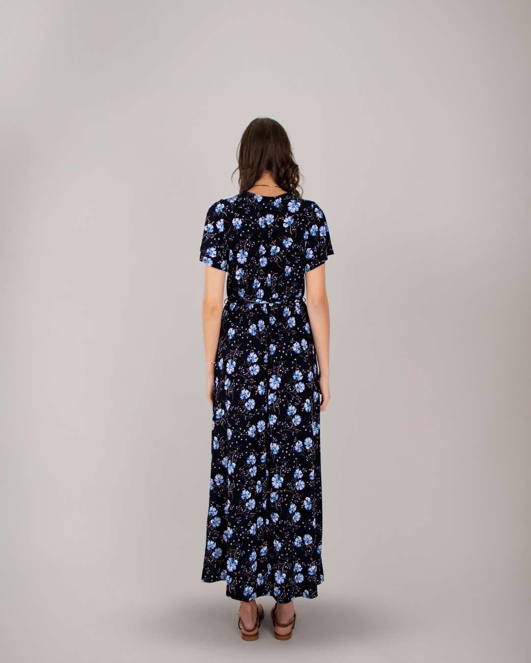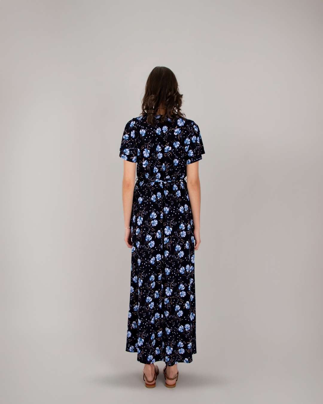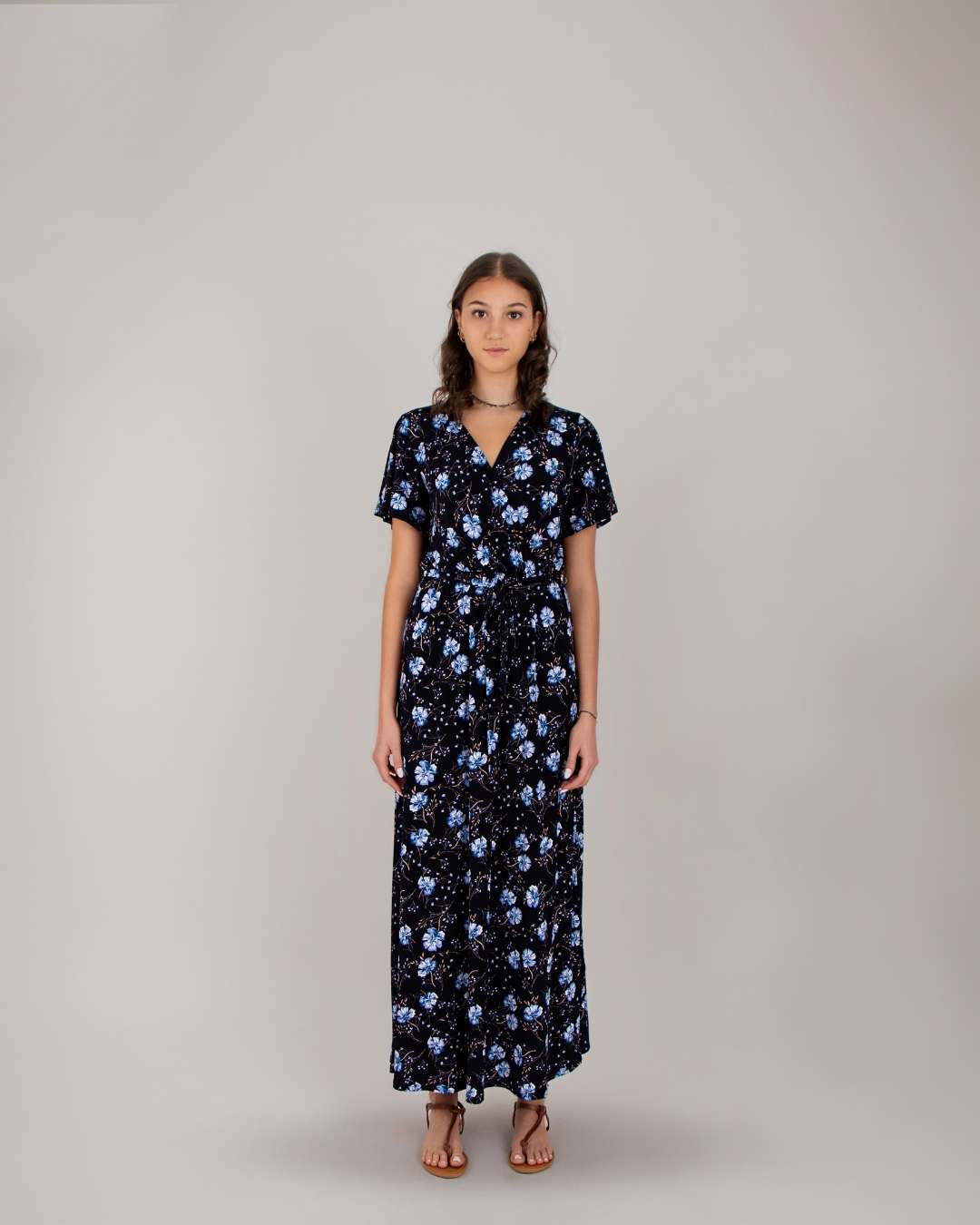 Vestido largo, escote en pico, mangas de ajuste suelto, detalle en cintura con nudo, estampado floral. Modelo 1.78 cm de altura.