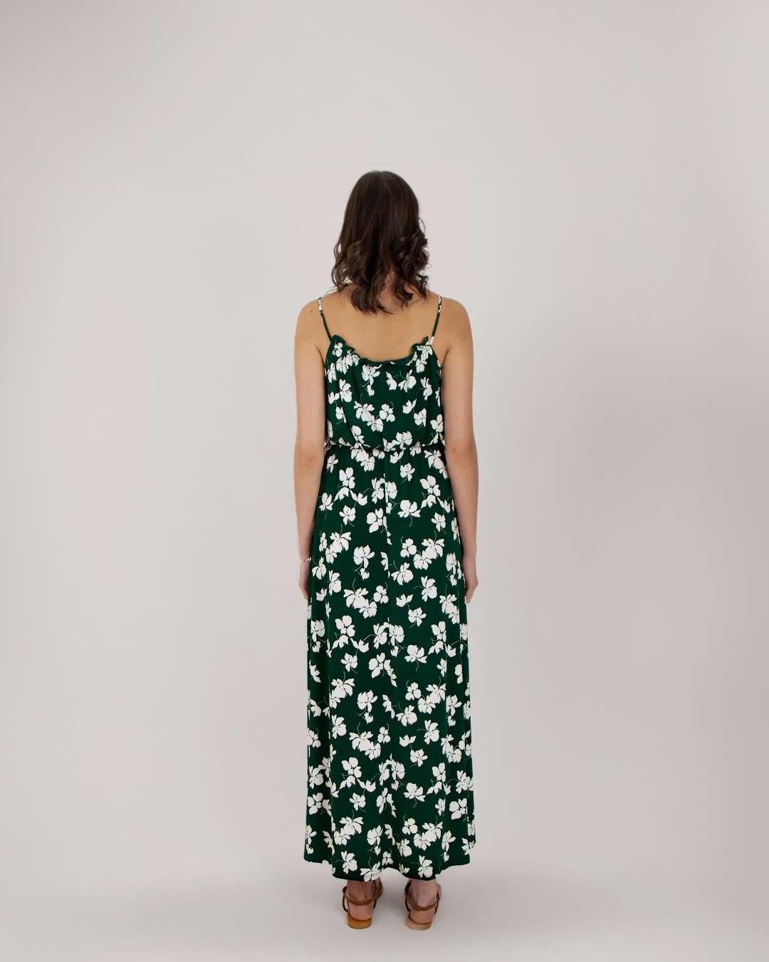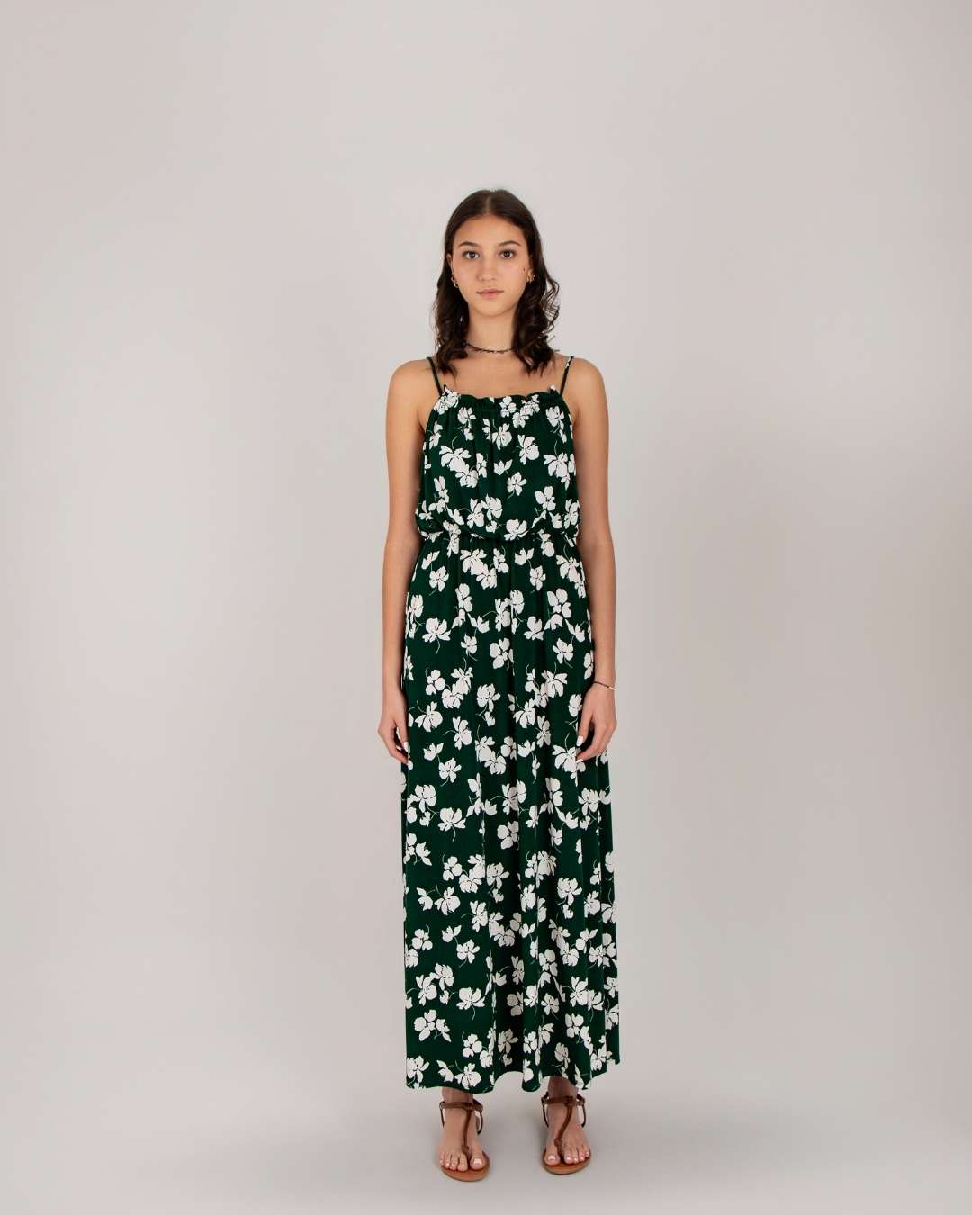 Vestido largo, estampado floral, escote recto y tirantes finos, ajustado en cintura. Modelo 1.78cm de altura.